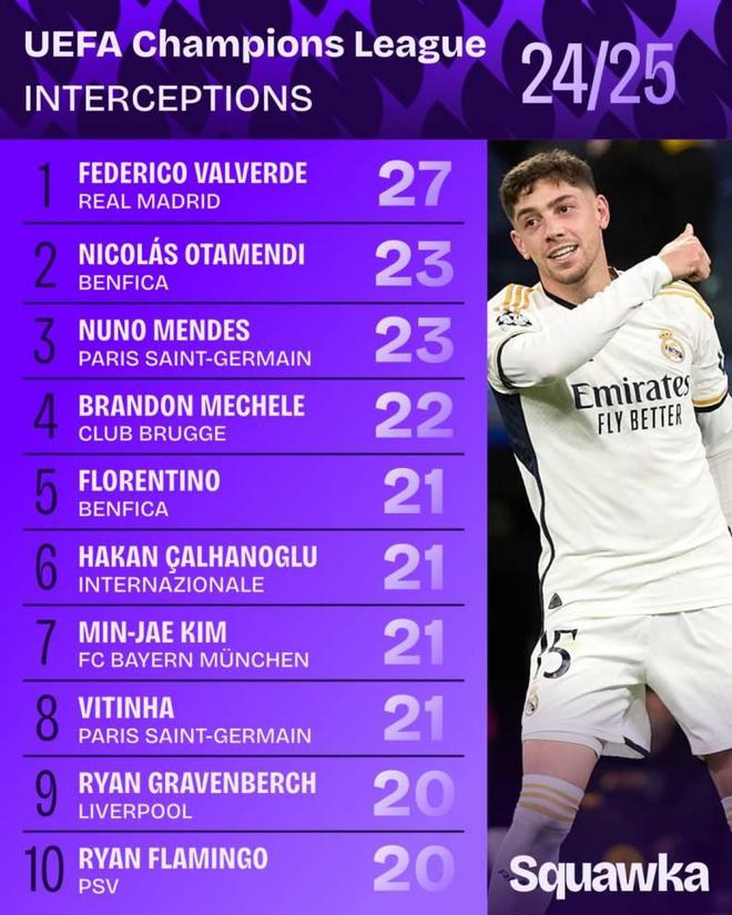 24/25賽季歐冠攔截榜:巴爾韋德27次列首位,努諾-門德斯第三